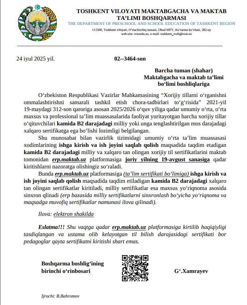 Shuningdek, Maktabgacha va maktab ta’limi vazirligi xorijiy til o‘qituvchilariga 2025/2026-o‘quv yiliga qadar B2 darajadagi sertifikatlarga ega bo‘lish lozimligi haqida qat’iy ogohlantirish bergan.